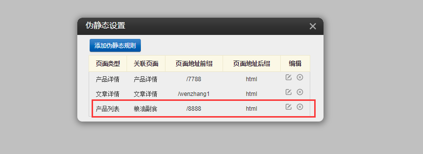 1.以PC端文章详情为例,首先在编辑器中点击“设置”-“伪静态设置”,点击“添加伪静态规则”,选择页面类型“文章详情”或者“产品详情”,选择关联页面并填写页面地址前缀,都为必填项,页面地址后缀可二选一,填写完成后点击保存即可,如图所示: